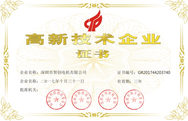 2017年10月31日,经全国高新技术企业认定管理工作领导小组认定,深圳市智创电机有限公司认定为高新技术企业,并已授牌!